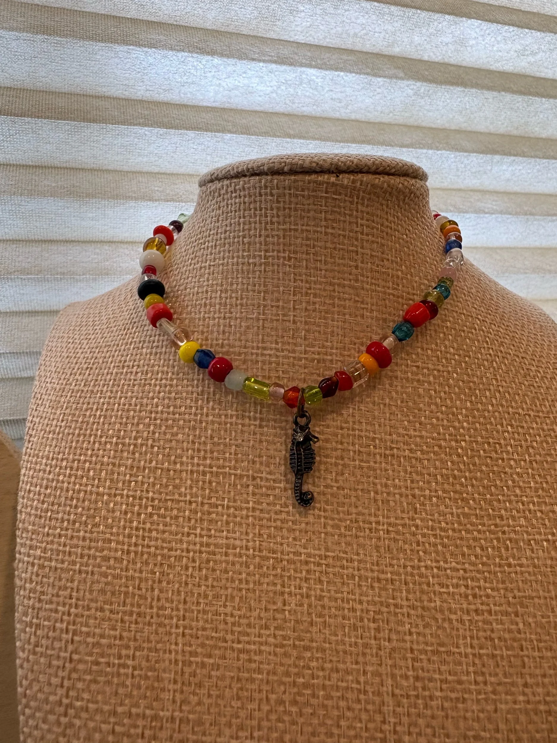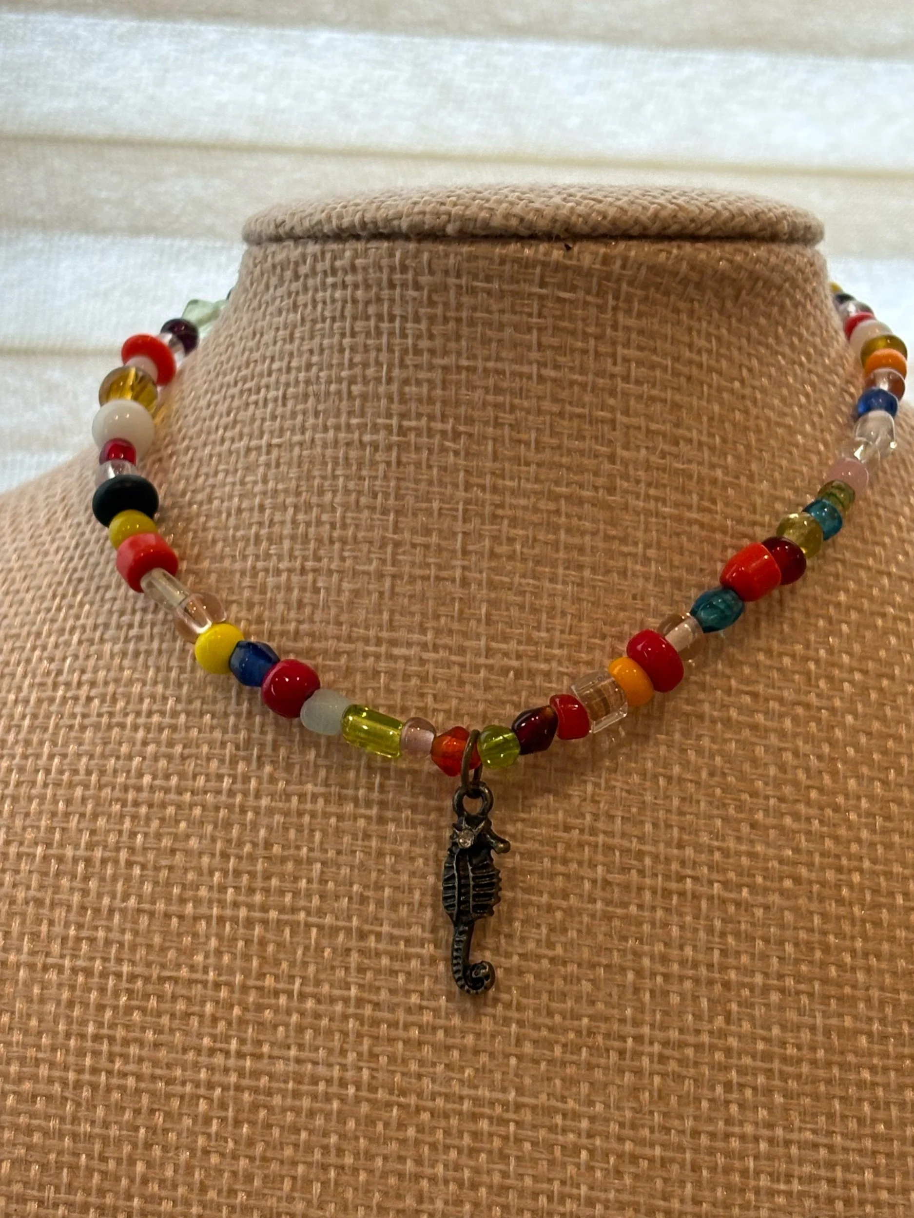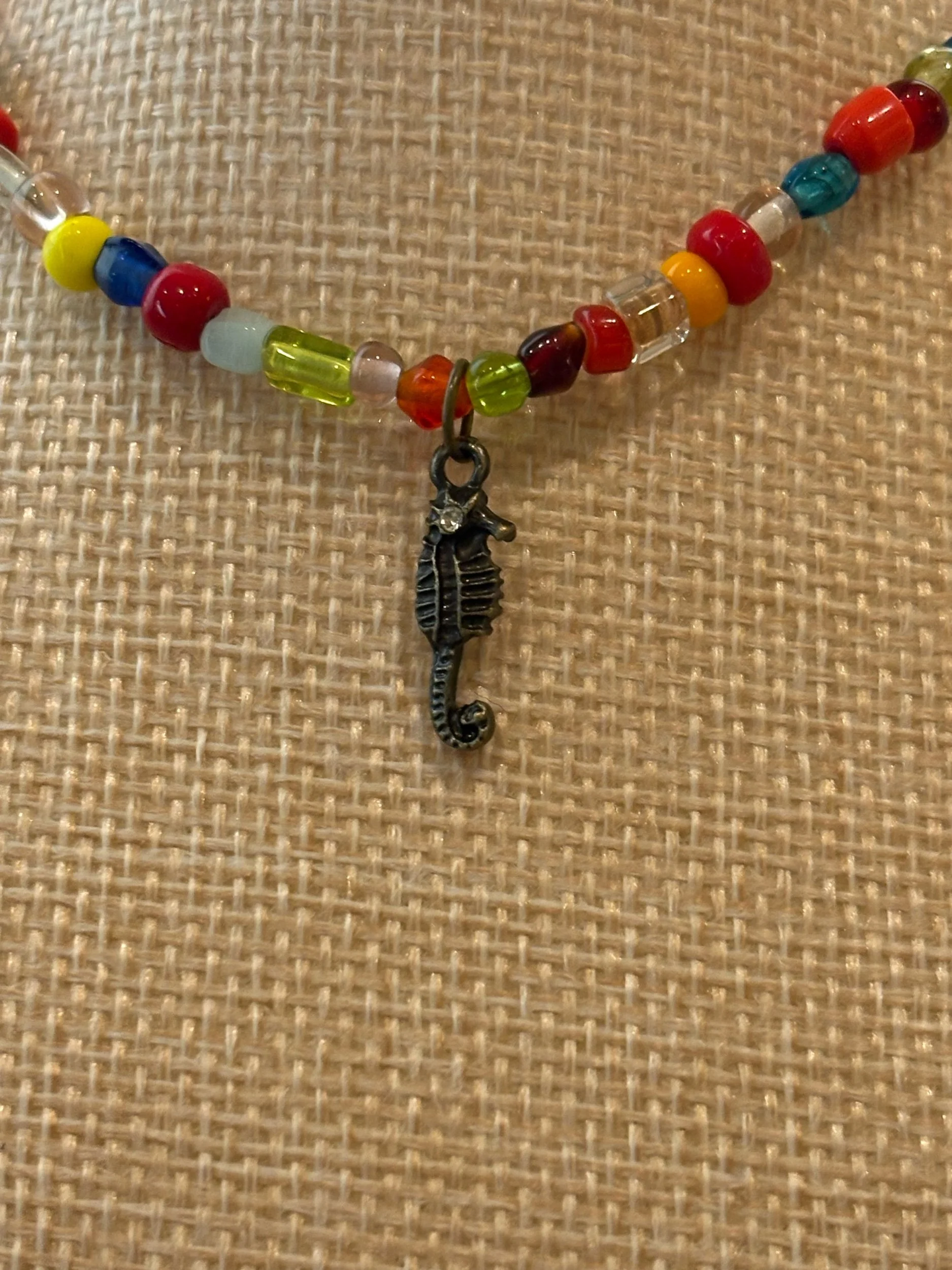 Bring a splash of playful coastal charm to your look with this vibrant, handcrafted anklet. Featuring a mix of colorful glass beads in warm sunset hues and ocean-inspired tones, each piece is thoughtfully strung to create a fun yet balanced design. At the center, a detailed antique-style seahorse charm adds a unique seaside touch, making this anklet perfect for beach days, summer outfits, or anyone who loves ocean-inspired jewelry. Lightweight and comfortable, it’s ideal for everyday wear or layering with your favorite anklets for a bold, carefree vibe. Lobster Claw Clasp.
