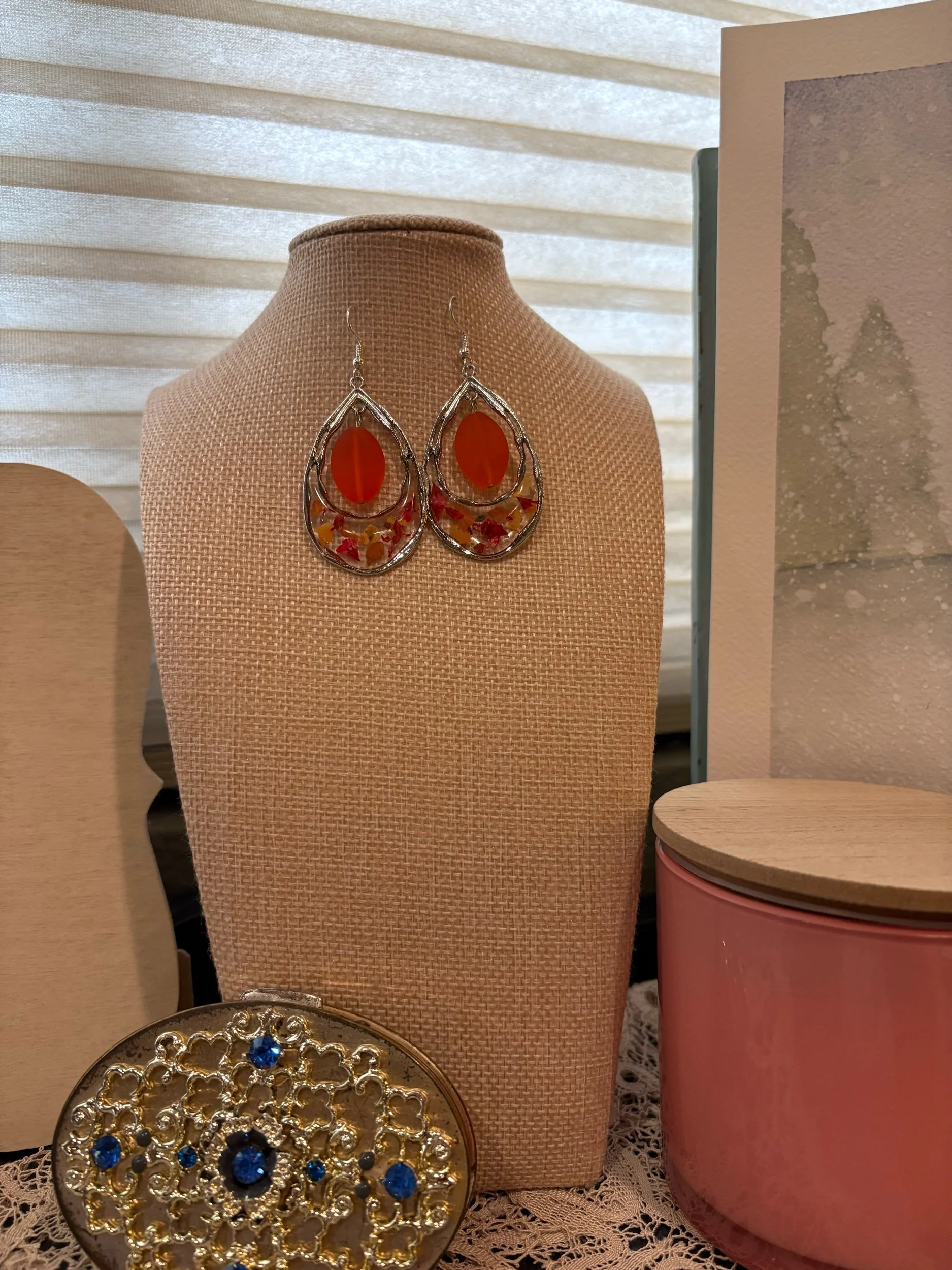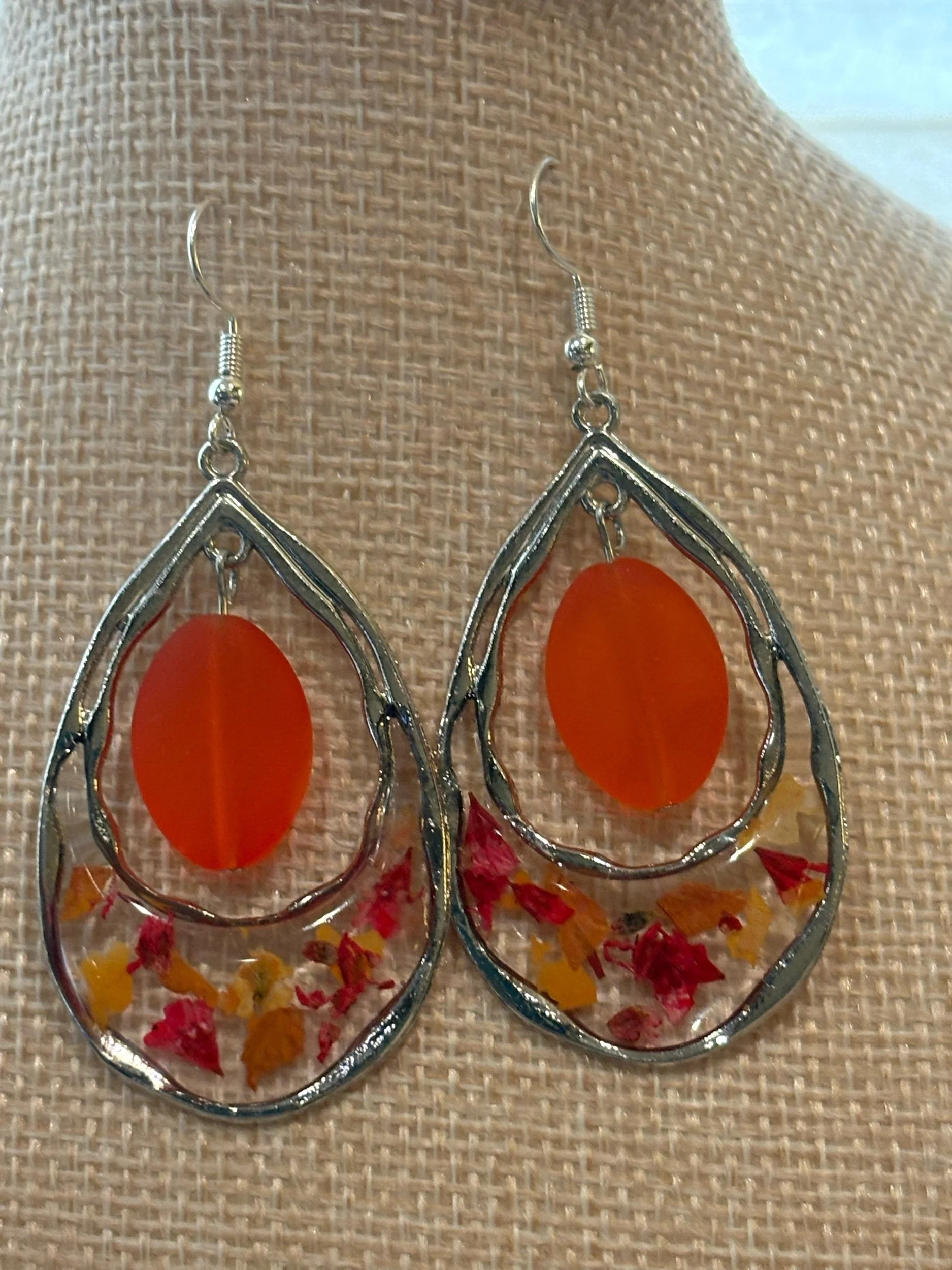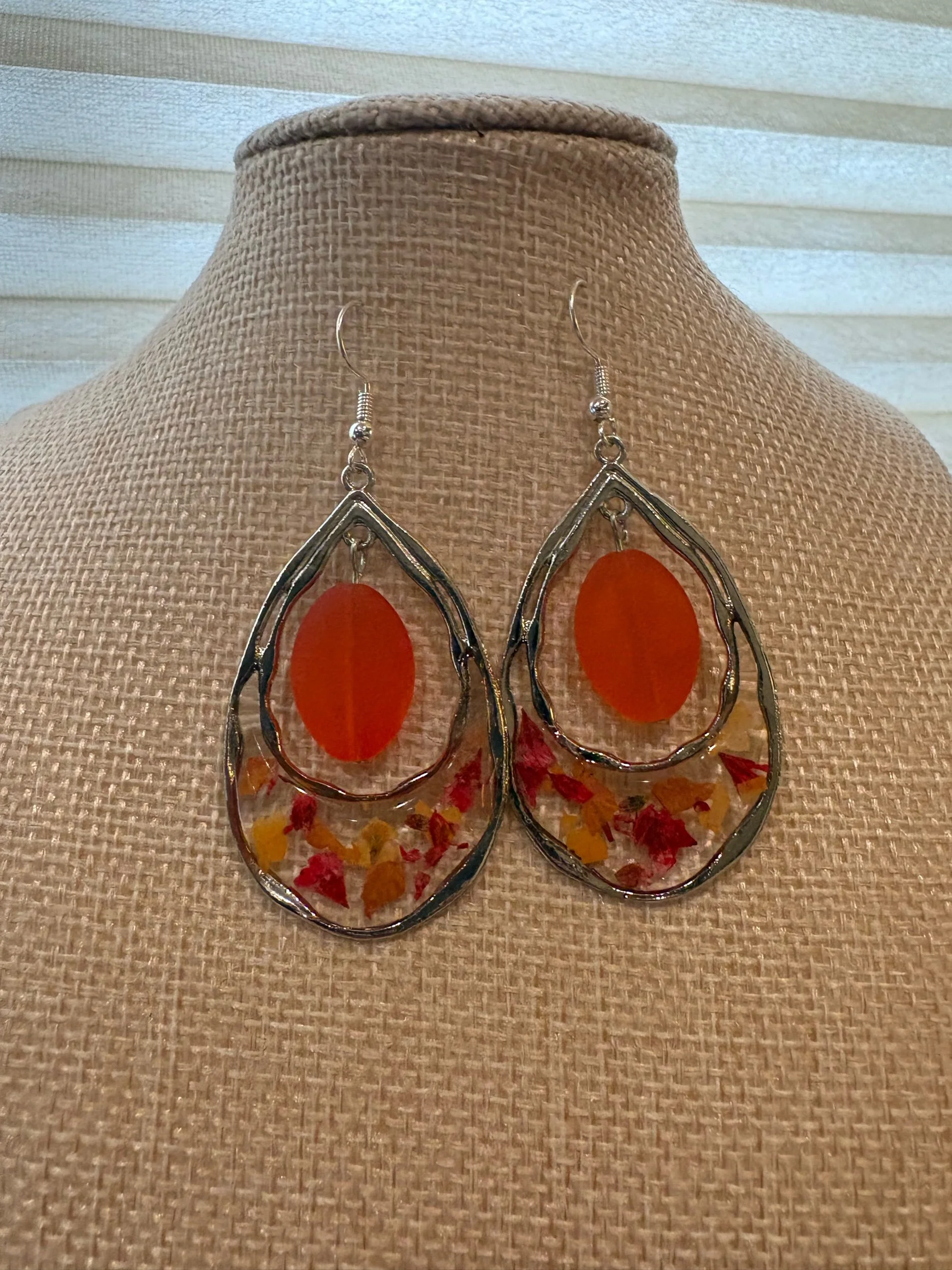 Capture the warmth of golden hour with these handcrafted teardrop earrings, designed to bring a soft glow to any look. Each piece features a vibrant matte orange oval centerpiece suspended within a silver-tone frame, paired with a delicate resin base filled with real pressed flowers in warm hues of red, amber, and gold.